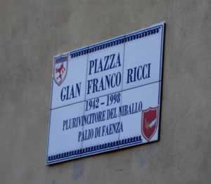 L’8 maggio scorso si è inaugurata a Faenza la piazza Gianfranco Ricci, per iniziativa del locale Rione Rosso. Ricci era nato in questa città nel 1942 e ivi prematuramente scomparve nel 1998.
