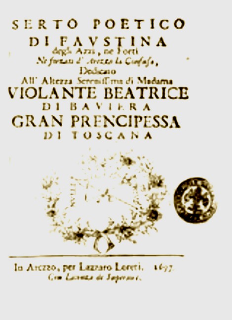 Nel 1697, ad Arezzo, coi tipi di Lazzaro Loreti, pubblicherà il suo “Serto Poetico” dedicato all’altezza serenissima Violante Beatrice di Baviera, gran principessa di Toscana. La tipografia Loreti si trovava sotto le Logge, in locali della Fraternita.