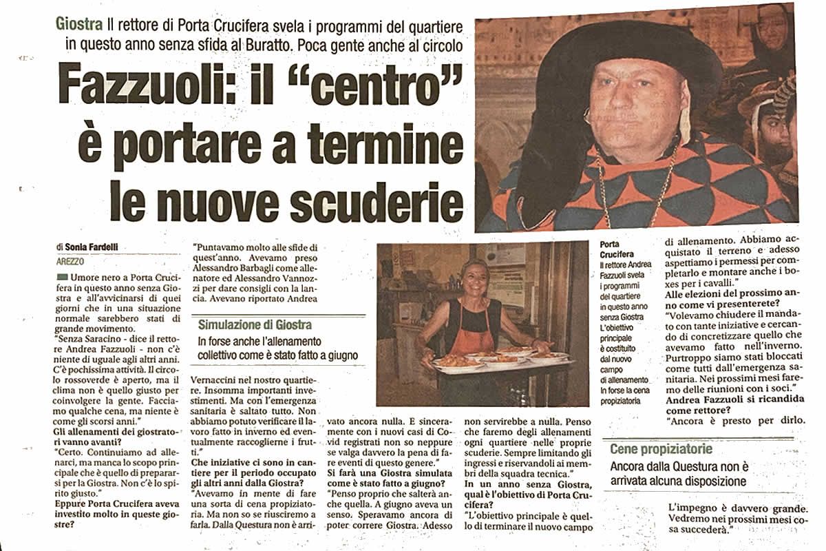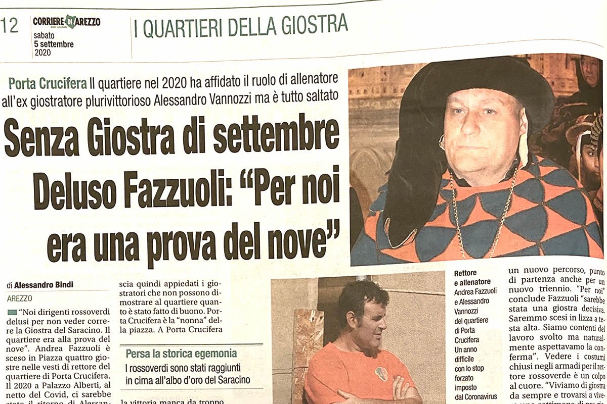 Nel Corriere di Arezzo, sabato 5 settembre, sono state pubblicate due interviste ai nostri dirigenti. La prima al Rettore, Andrea Fazzuoli, che si dichiara dispiaciuto di non aver potuto correr Giostra e la seconda al Capitano Andrea Bidini che riferisce sul buono stato di preparazione dei nostri c…