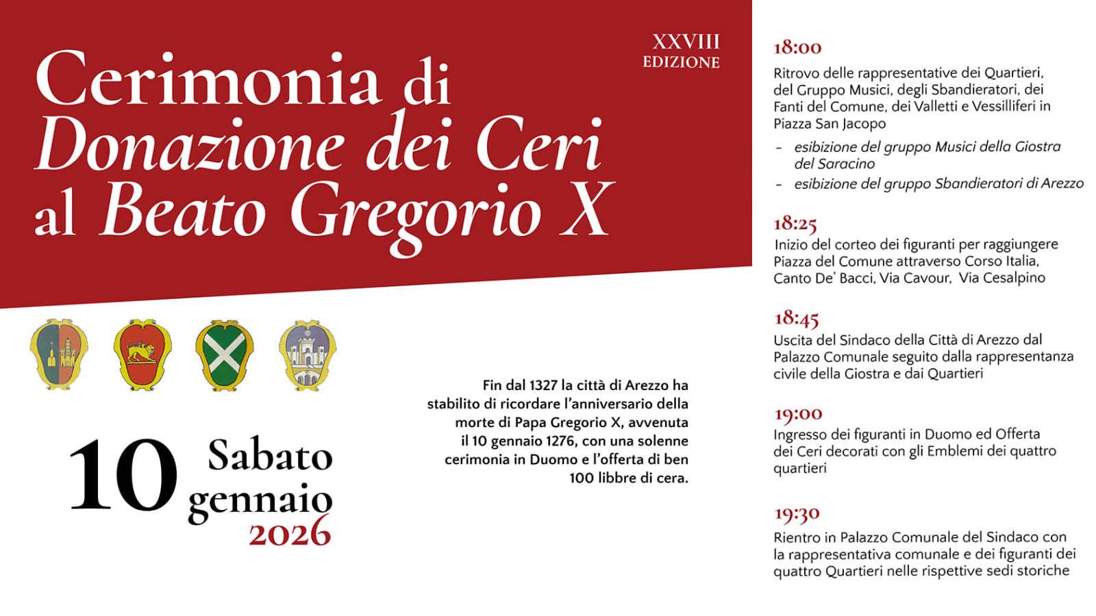 Sabato 10 gennaio si apre l’Anno Giostresco 2026 con la ventottesima edizione della Cerimonia di Offerta dei Ceri al Beato Gregorio X con la Donazione dei Ceri in Cattedrale preceduta dallo spettacolo offerto da Musici e Sbandieratori in piazza San Jacopo a partire dalle 18.00.