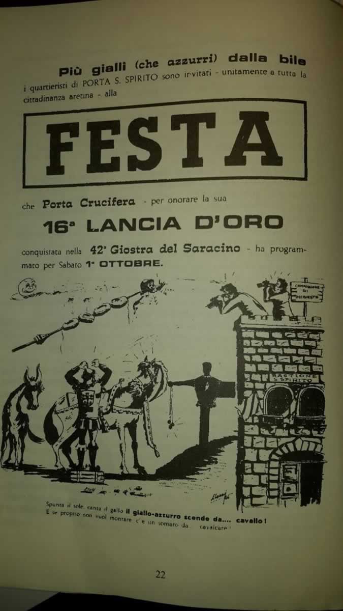Correva l'anno 1966 e Porta Crucifera si apprestava a disputare la 42esima edizione della Giostra del Saracino, dato già per vinto. Alta era la pressione dovuta al digiuno che durava ormai da ben 8 giostre, da quel lontano 1958, ultima vittoria rosso verde di Arturo Vannozzi passato poi nelle spond…