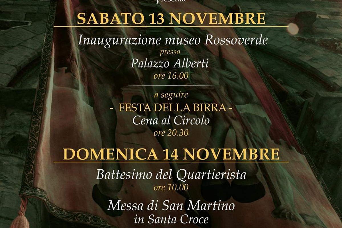 ❤️ giovedì 11 novembre messa a Santa Croce ore 18 💚sabato 13 ore 16 inaugurazione museo Rossoverde presso Palazzo Alberti a seguire festa della Birra ❤️ domenica 14 ore 10 battesimo del Quartierista 💚 ore 12 messa a Santa Croce con i figuranti