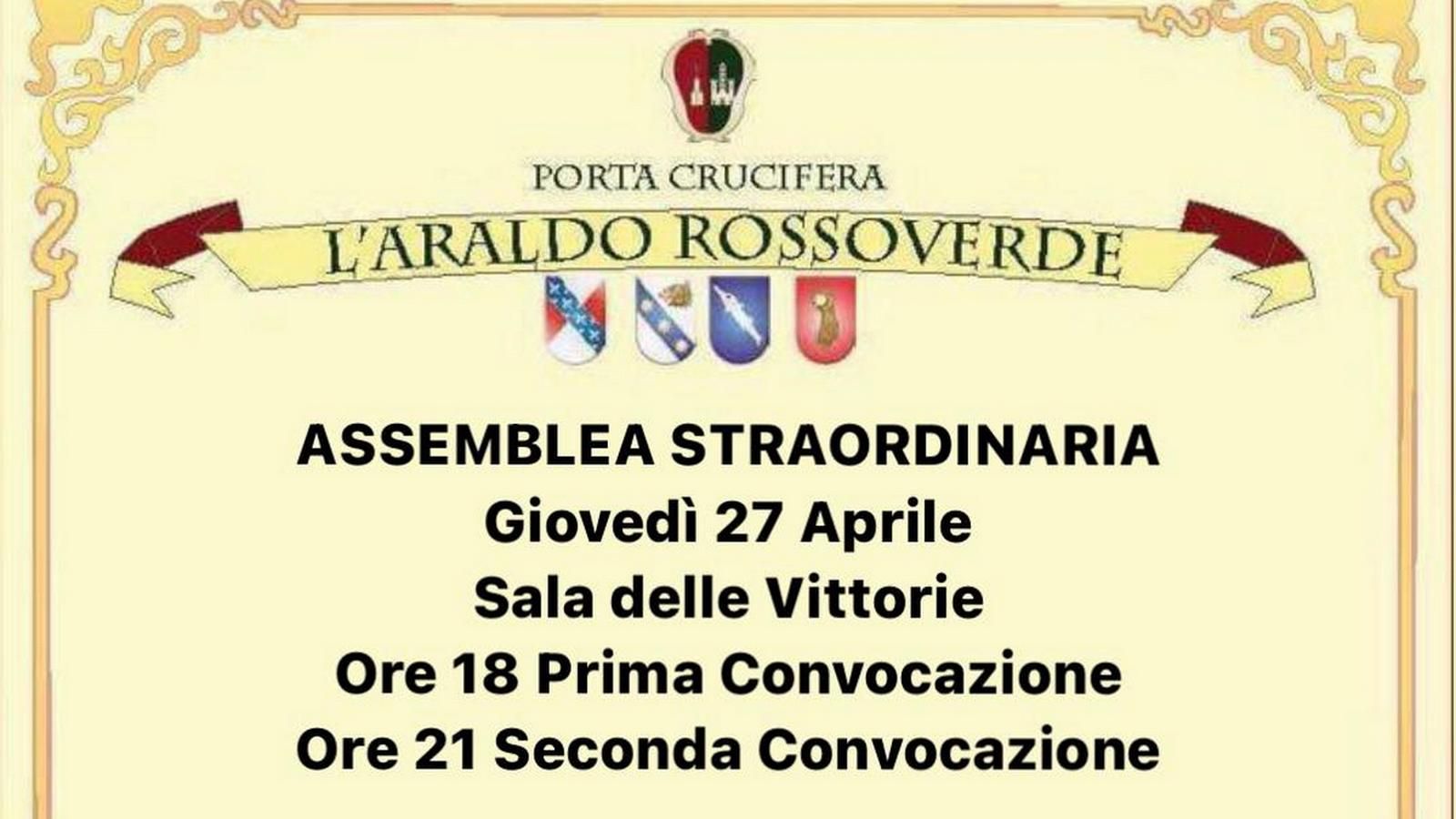 Il Consiglio Direttivo convoca per il prossimo lunedì 7 marzo l’Assemblea Ordinaria dei Soci del Quartiere di Porta Crucifera alle ore 20:30 in prima convocazione e occorrendo alle ore 21:30 in seconda convocazione con il seguente ordine del giorno: