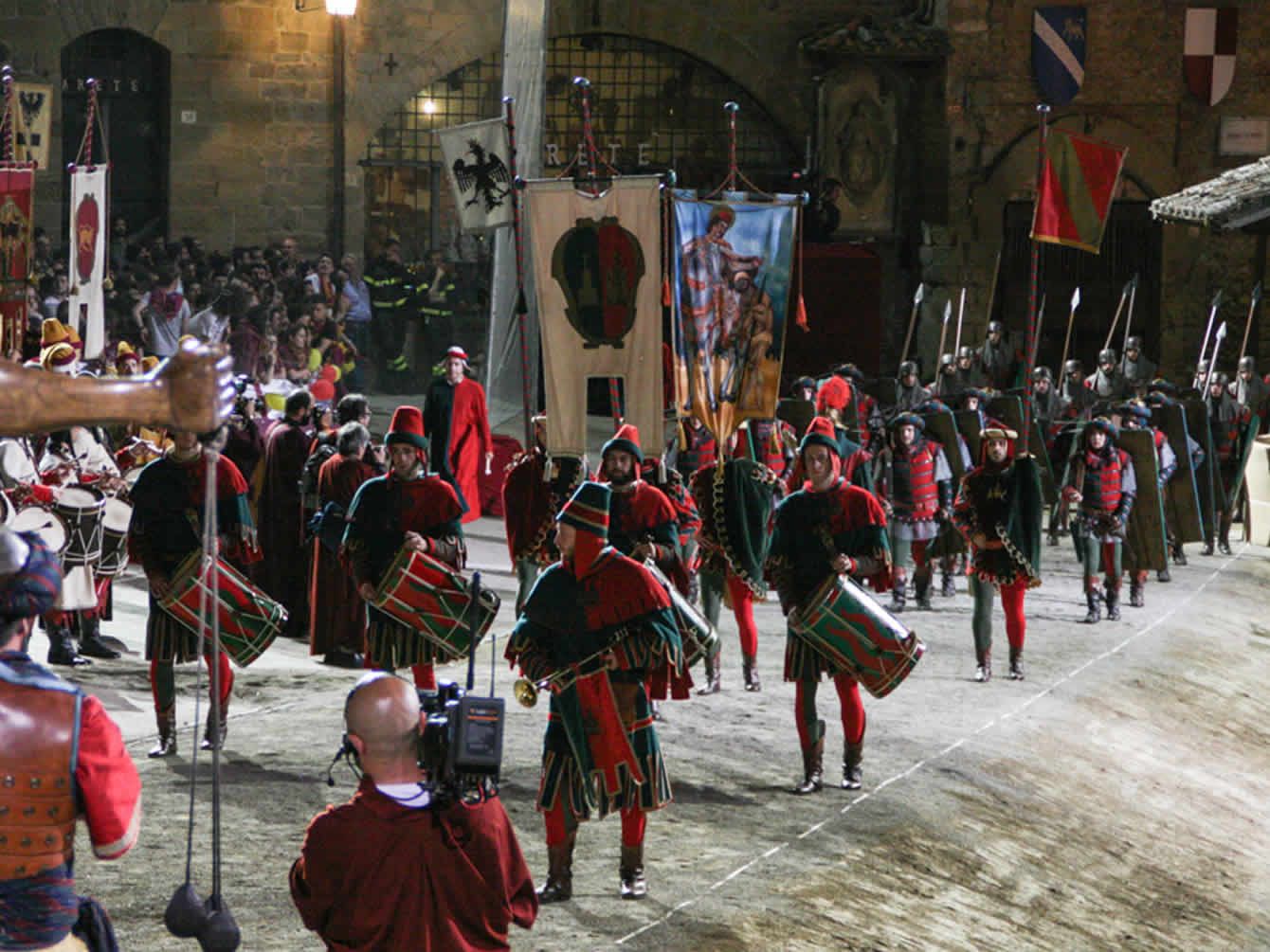 Gli squilli delle chiarine e il rullo dei tamburi rievocano il basso medioevo, epoca di giostre e dei tornei cavallereschi. Il Gruppo Musici ha in repertorio motivi esclusivi di ispirazione trecentesca, diversi per musica e ritmi l'uno dall'altro.
