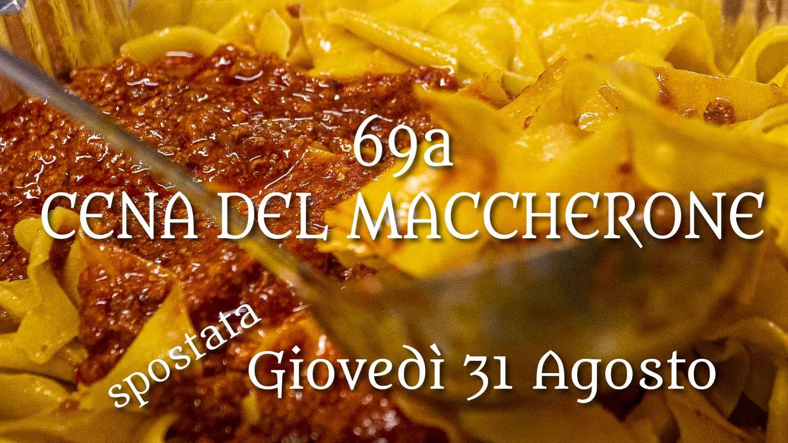 Viste le avverse condizioni meteorologiche previste nella giornata di Mercoledì 30 Agosto, il Consiglio Direttivo ha deciso di spostare la 69ª Cena del Maccherone a Giovedì 31 Agosto per assicurare uno svolgimento sereno e senza imprevisti.