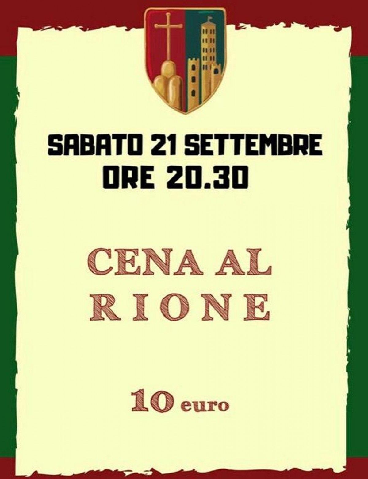 CENA AL RIONE —> SAB 21 SETT sabato alle ore 20,30 cena al rione a soli 10€ Questo il menù: - bruschette miste e sformatino - penne pomodoro e salsiccia - dolce - acqua e vino Prenotazione obbligatoria Luca 3336523267 o Rossano 347 9309918Vi aspettiamo numerosi