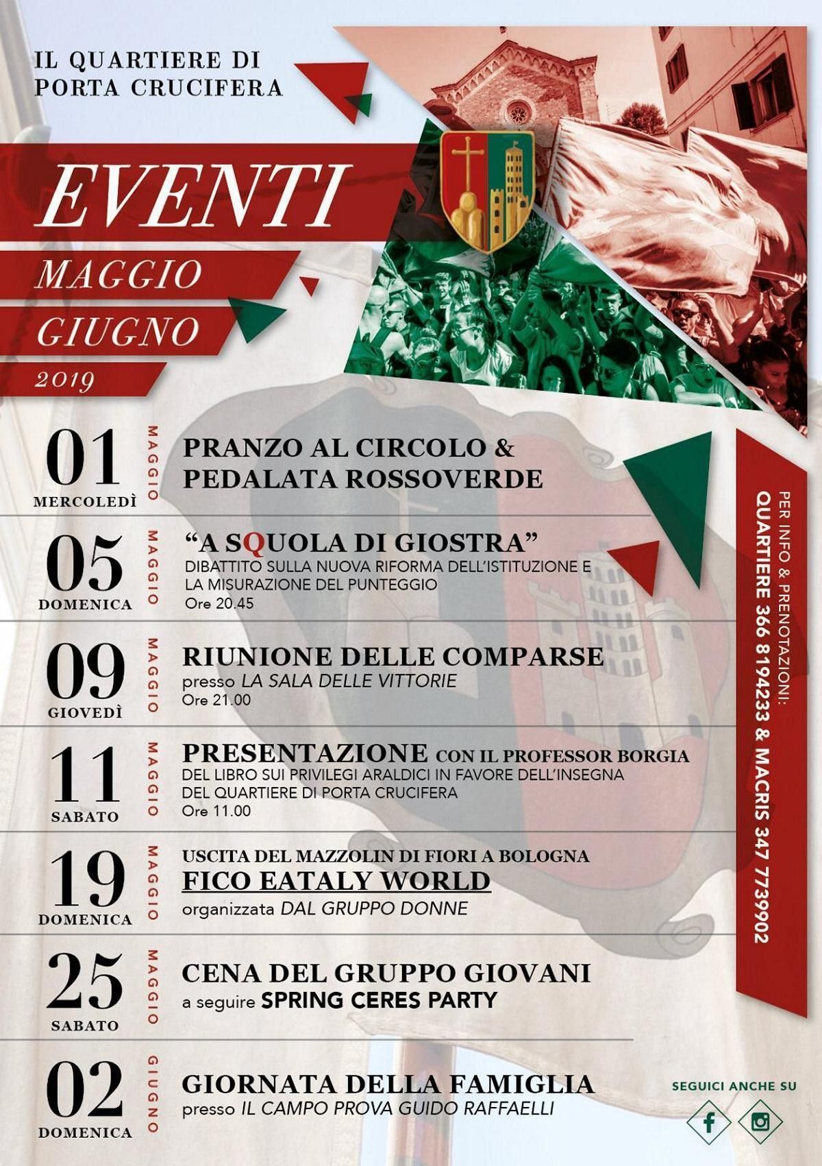 Passato il primo maggio con il successo della >Giovedi 9 alle 21, nella sala delle Vittorie, "la Riunione delle Comparse" Sabato 11 alle 11, la presentazione del libro sui privilegi araldici in favore dell'insegna del Quartiere con il Prof. Borgia Domenica 19 il "mazzolin di fiori" del Gruppo Donne…