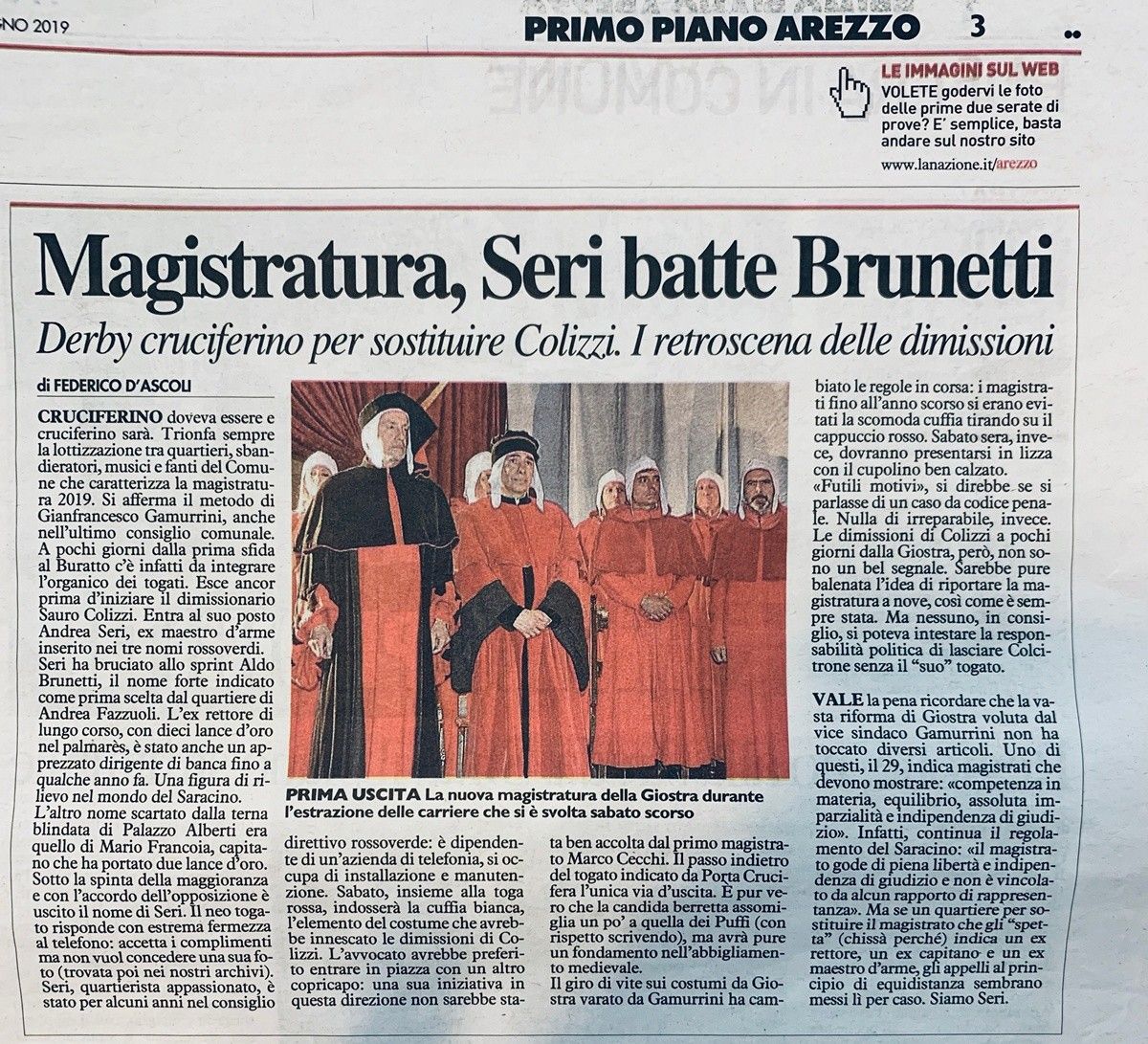 Complimenti vivissimi ad Andrea Seri che andrà a rivestire la carica di Magistrato della Giostra in sostituzione di Colizzi ... mentre La Nazione non evita di fare polemiche ...